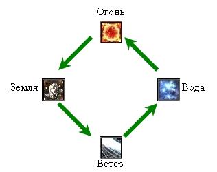 Стихия Огня сильно влияет на стихию Земли, слабо на стихию Воды, не влияет на стихии Ветра и Огня